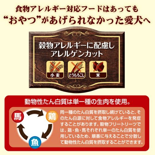 穀物アレルギーに配慮しアレルゲンカット。生の馬肉と14種類の野菜を使った総合栄養食のおやつです。