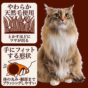 猫の細くてやわらかい被毛を無理なくとかすやわらかい天然毛。段カット植毛で被毛の奥まで届きやすい。密に埋め込まれたブラシが被毛にまんべんなく入り込み、とかすほどに被毛にツヤを与える。猫の体の丸みや細部に合わせてブラッシングしやすい手にフィットするブラシ形状。