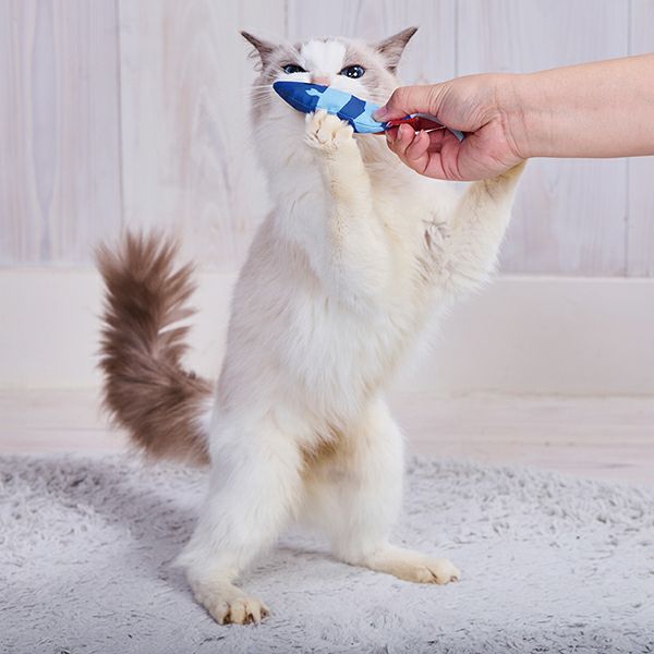 止めたり急に動かすことで、猫の狩猟本能が目覚めてじゃれて遊びます。