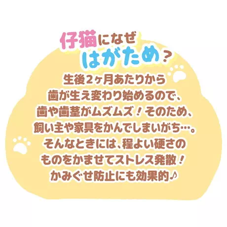仔猫は、生後2ヶ月あたりから歯が生え変わり始めるので、歯や歯茎がムズムズします。そのため、飼い主や家具をかんでしまいがち…。そんな時には、程よい硬さのものをかませてストレス発散しましょう!かみぐせ防止にも効果的です。