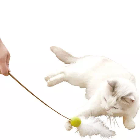 天然の鳥毛を使用したじゃらしに大興奮!持ち手の先端にウールボールがついたスティックタイプ