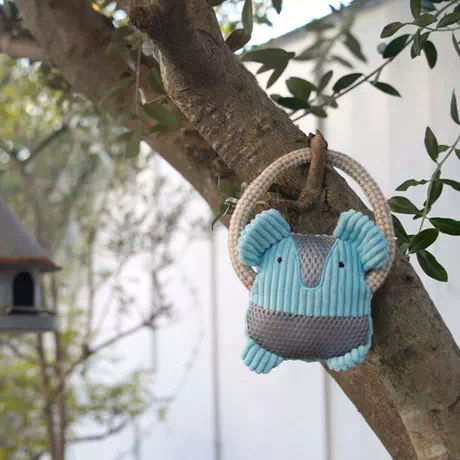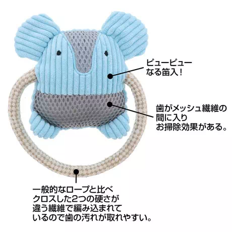 ロープとメッシュ生地が歯の隙間に入り、遊びながら歯のお掃除ができる。ピューピューなる笛入り。