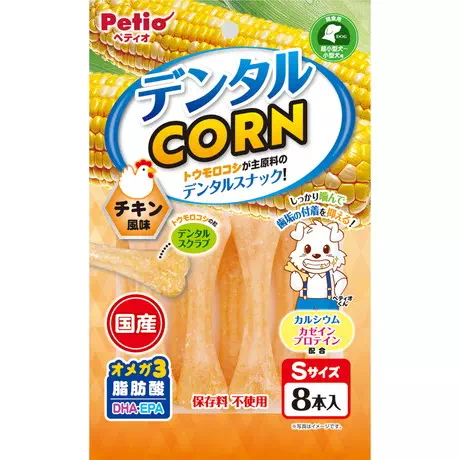 トウモロコシが主原料のデンタルスナック。しっかり噛んで歯垢の付着を抑える!オメガ3脂肪酸(DHA・EPA)・カルシウム・カゼインプロテイン配合 デンタルコーン チキン風味 Sサイズ 8本入×3個パック デンタルCORN