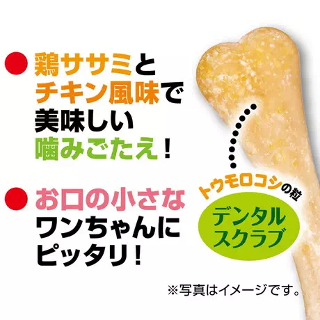 歯とカラダの健康維持は噛むことから!鶏ササミ入りの美味しいチキン風味デンタルスナック!歯と骨の健康を維持するカルシウム、トウモロコシでできたデンタルスクラブ、ゆるやかに吸収できるカゼインプロテイン配合。お口の小さなワンちゃんにピッタリ!