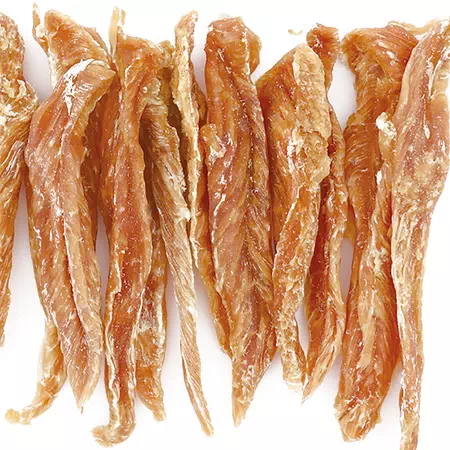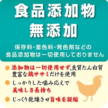 鶏ササミをじっくり乾燥させることで素材本来の旨味を凝縮し、しっかりとした噛み応えで美味しさが長持ちするよう仕上げました。ササミ100%使用。添加物は使っていません。