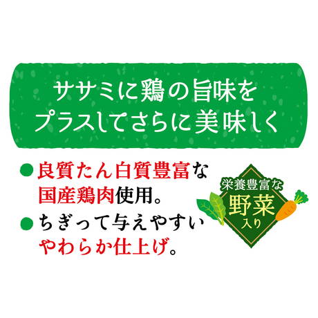合成着色料・保存料・発色剤といった気になる添加物をカットしました。ササミに鶏の旨味をプラスしてさらに美味しく仕上げました。良質たん白質豊富な国産鶏肉使用。栄養豊富な野菜入り。小型犬・シニア犬にもちぎって与えやすいやわらか仕上げ。