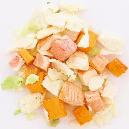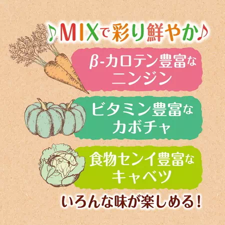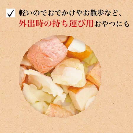 そのままでも与えやすいひとくちサイズ。細かく砕いてフードのトッピングに、幼犬やシニア犬にも食べやすくぬるま湯や水でふやかして、軽いのでおでかけやお散歩など外出時の持ち運びおやつに…様々な目的に合わせてアレンジできる。MIXで彩り鮮やか。β-カロテン豊富なニンジン、ビタミン豊富なカボチャ、食物センイ豊富なキャベツのいろんな味が楽しめる。保存料・着色料 無添加。