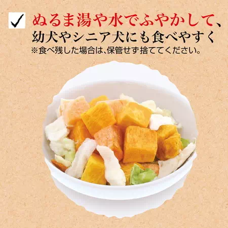 ●ぬるま湯や水でふやかすことで、幼犬やシニア犬にも食べやすくなります。