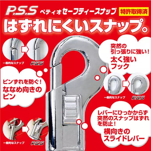 ・レバーにひっかからず突然のスナップはずれを防ぐ横向きのスライドレバー