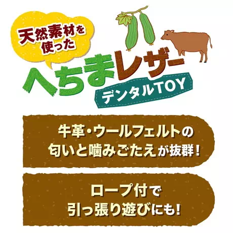 天然素材であるへちまと牛革を使用したデンタル玩具。レザーとウールフェルトの香りで思わずカミカミ!へちまの繊維に歯が食い込み歯をブラッシング。