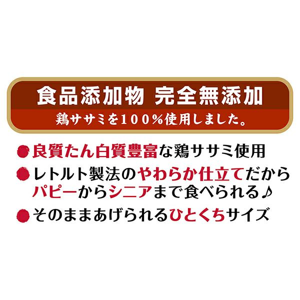 他の画像を見る 素材本来の美味しさが味わえるササミ角切り 「旨味プラス製法」でさらに美味しく 素材そのまま ササミ角切りソフト 130g 通常価格 ¥ 767 販売価格 ¥ 767 税込 お気に入りに追加