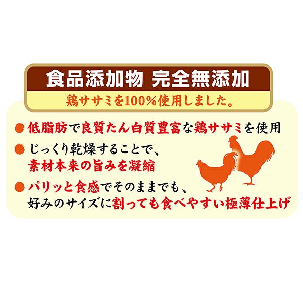 他の画像を見る 良質たん白質豊富な鶏ササミだけを使用した食品添加物完全無添加のスナックです。そのままでも、サクッと割っても食べやすいスライスタイプ。ササミ100%。 【本店限定特価】素材そのまま 完全無添加 ササミスライス 140g 通常価格 ¥ 1,298 販売価格 ¥ 1,188 税込 お気に入りに追加