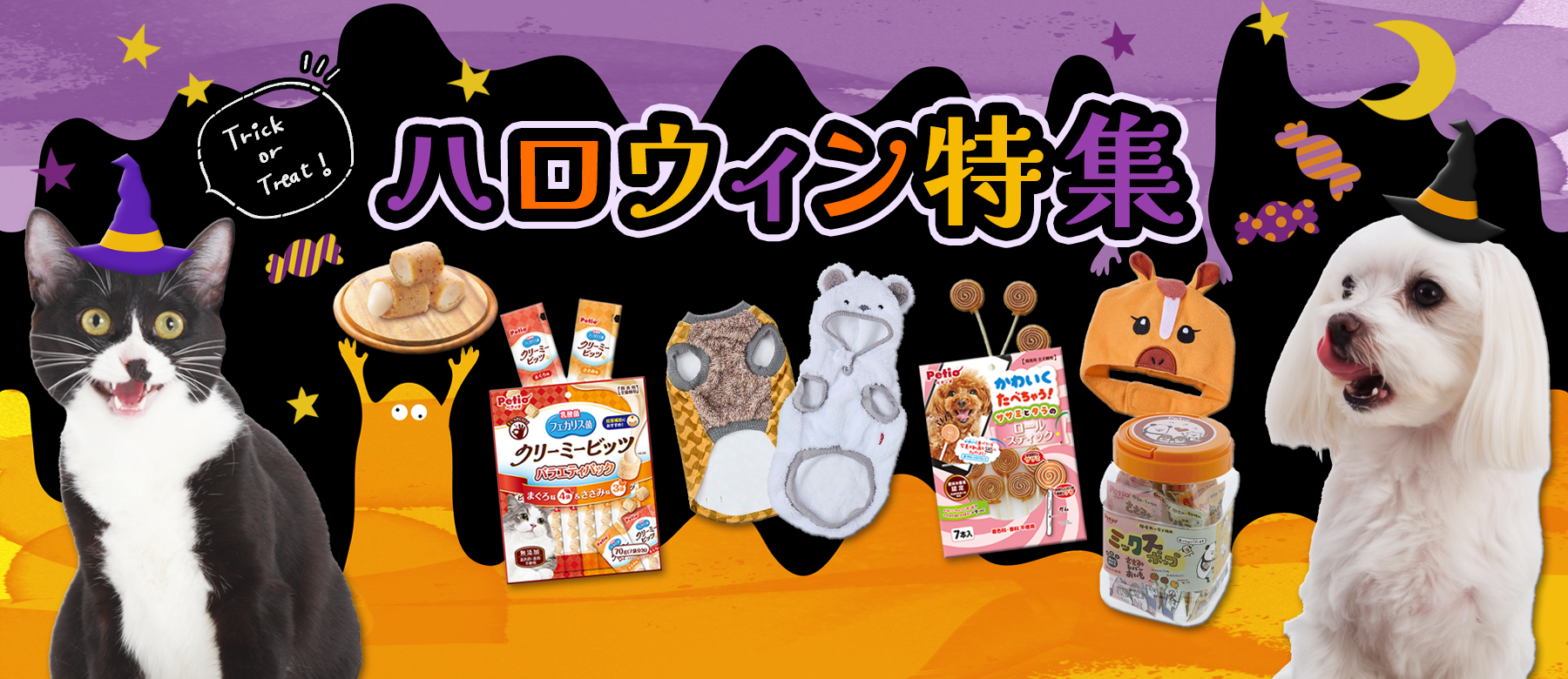 ハロウィンパーティに便利なワンちゃん・ネコちゃんの個包装おやつやかわいいおやつ、かわいく変身できちゃうウェアを集めました!