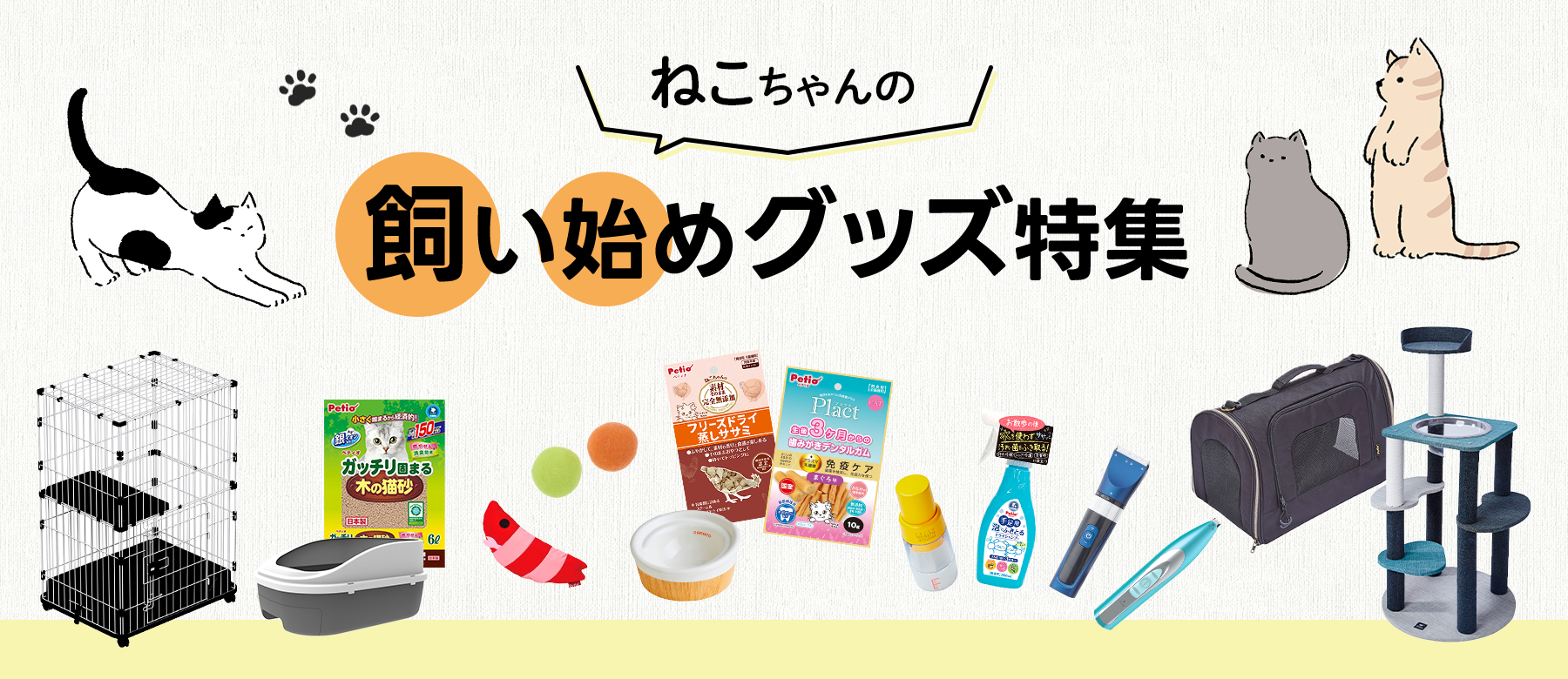 おやつ、おもちゃ、猫砂・トイレ用品、ケージ・キャットタワー、爪とぎなどなど!