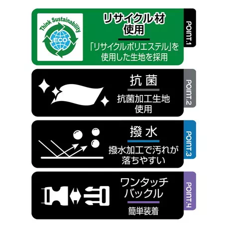 リサイクルポリエステルを使用し、抗菌加工を行った生地を使用。撥水加工で汚れが落ちやすい。容易に付け外しができるワンタッチバックル採用。人気の迷彩柄。