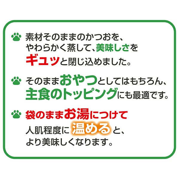 他の画像を見る ほたてとかにの旨味エキス入り蒸しかつお。温めると一層美味しく。やわらかくほぐして食べやすい。じっくり蒸して風味を閉じ込めました。 できたて厨房 キャット 蒸しかつお 2本入 通常価格 ¥ 217 販売価格 ¥ 217 税込 お気に入りに追加
