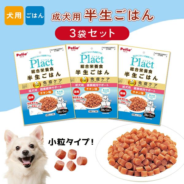 毎日のごはんに乳酸菌プラス。キリンの35年の免疫研究が発見したプラズマ乳酸菌配合。健康を維持し、免疫力を保つ”免疫ケア”。トッピングやしつけのご褒美にも適した成犬用セミモイストフード。 【13%OFF】Plact プラクト 総合栄養食 半生ごはん 成犬用健康サポート 150g×3個 450g【3個セット】
