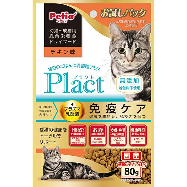 毎日のごはんに乳酸菌プラス。KIRINの免疫研究が発見したプラズマ乳酸菌配合。健康を維持し、免疫力を保つ”免疫ケア”。ネコちゃんの健康に配慮した全成長段階用キャットドライフードお試しパック3種アソート。 【14%OFF】【お試しセット品】Plact プラクト キャット ドライフード 3種アソート カツオ チキン フィッシュミックス味 80g×3個 幼猫~成猫用