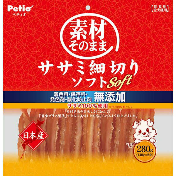 良質たん白質豊富な鶏ササミを100%使用(使用肉原料として)。「旨味プラス製法」でさらに美味しさを感じられるよう仕上げました。小型犬・シニア犬にも食べやすいやわらか食感の細切りタイプ。姫路工場(自社工場)で心を込めて丁寧に作りました。便利な2袋分包。着色料・保存料・発色剤・酸化防止剤無添加。グレインフリー。