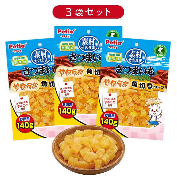 豊富な食物センイとまろやかな甘味のさつまいもをまるごと使用。やわらかタイプで、お口の小さなワンちゃんも食べやすい。お得な3個セット。 【7%OFF】素材そのまま さつまいも やわらか角切りタイプ 140g【3個セット】