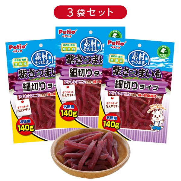 ほっこり甘い紫さつまいもをそのまま使用。手でちぎって与えやすい細切りタイプ。お得な3個セット。 【7%OFF】素材そのまま 紫さつまいも 細切りタイプ 140g【3個セット】