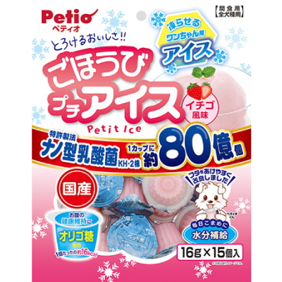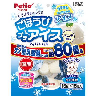 お散歩から帰ったときに、暑さで元気がないときに、ご飯の後のデザートに、お家の冷凍庫で凍らせるだけで簡単に与えられるワンちゃん用アイス!お腹の健康維持のためにオリゴ糖も配合。