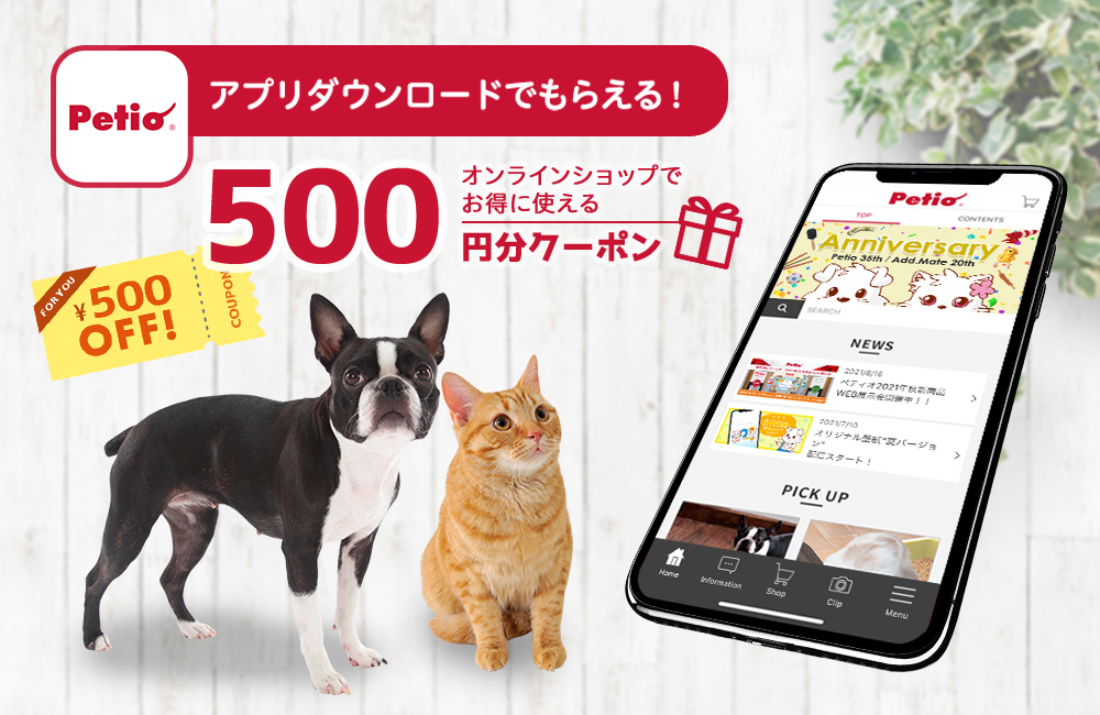 *1:初回ダウンロード時・3ヶ月に1回500円クーポンを配布中です。 *2:Instagramで「#petioモデル」をつけて投稿すると、ペティオ公式アプリのClipに掲載される可能性あり。