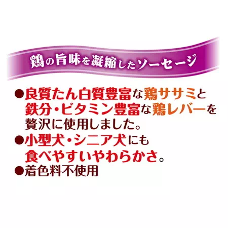 鉄分・ビタミン豊富な鶏レバーと良質な鶏ササミを贅沢に使用したソーセージ!小型犬・シニア犬にも食べやすいやわらかさ、食べきりサイズに仕上げました。個包装だから、いつでも開けたての美味しさが楽しめて、お出かけやお散歩に便利です。着色料 不使用。