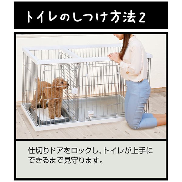 他の画像を見る スペースを区切れるからトイレの場所を覚えやすい! 【22%OFF】トイレのしつけが出来る ドッグルームサークル ホワイト ワイド 通常価格 ¥ 43,780 販売価格 ¥ 34,100 税込 ●開閉がスムーズなスライドドア●仕切りドア・・・2つのスペースに分ける仕切りドアがあるので、トイレの場所を覚えやすい!●トイレ取り出しドア・・・取り出しドアからトイレを取り出せるので、頻繁に取り替えるシーツ交換がラクラク!●トレー形状・・・おしっこが住居スペースに入るのを防ぐ!食べこぼし、そそうをしても床を汚さない!●ぴったりサイズのトイレ付 お気に入りに追加