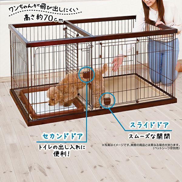 他の画像を見る スペースを区切れるからトイレの場所を覚えやすい! 【15%OFF】トイレのしつけが出来る ドッグルームサークル ブラウン ワイド 通常価格 ¥ 43,780 販売価格 ¥ 34,100 税込 ●開閉がスムーズなスライドドア●仕切りドア・・・2つのスペースに分ける仕切りドアがあるので、トイレの場所を覚えやすい!●トイレ取り出しドア・・・取り出しドアからトイレを取り出せるので、頻繁に取り替えるシーツ交換がラクラク!●トレー形状・・・おしっこが住居スペースに入るのを防ぐ!食べこぼし、そそうをしても床を汚さない!●ぴったりサイズのトイレ付 お気に入りに追加