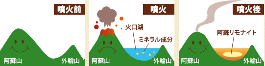 阿蘇山の噴火により作られた火口湖の中には、たくさんのミネラル成分を含んだマグマや有機物が蓄積し、水中で分離分解されました。その中で、溶出された鉄分を多く含む堆積物が、リモナイト鉱です。